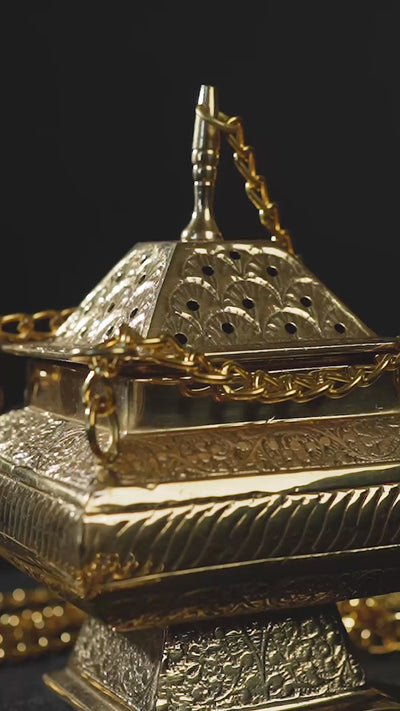 A brass thurible made from precisely pressed brass sheet, richly decorated with ornate detailing.