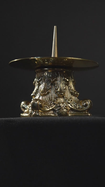 A low brass candlestick properly displays altar candles. The delicately decorated brass candlestick is an essential item for churches and parishes.