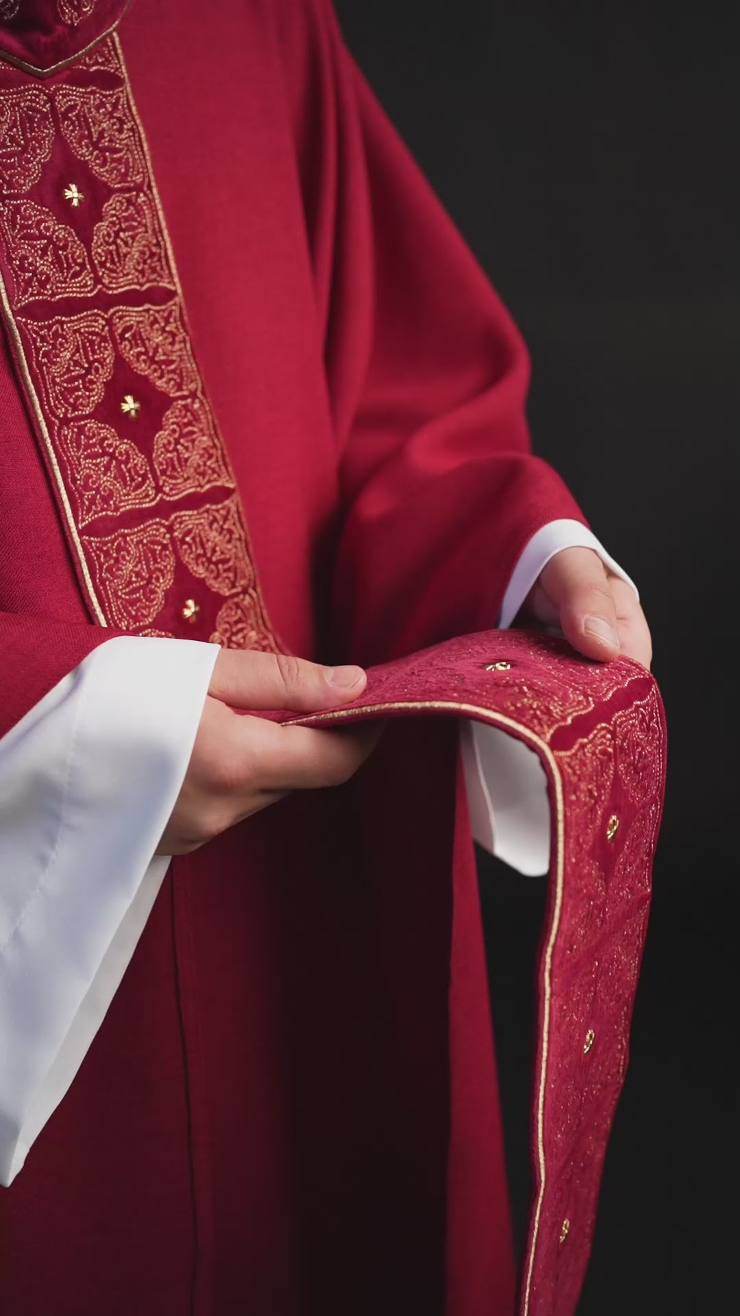 Masterfully crafted from high-quality fabric, our chasuble is the epitome of elegance and profound liturgical symbolism. Decorated with a richly embroidered belt and collar in red, our chasuble exudes majesty and beauty.