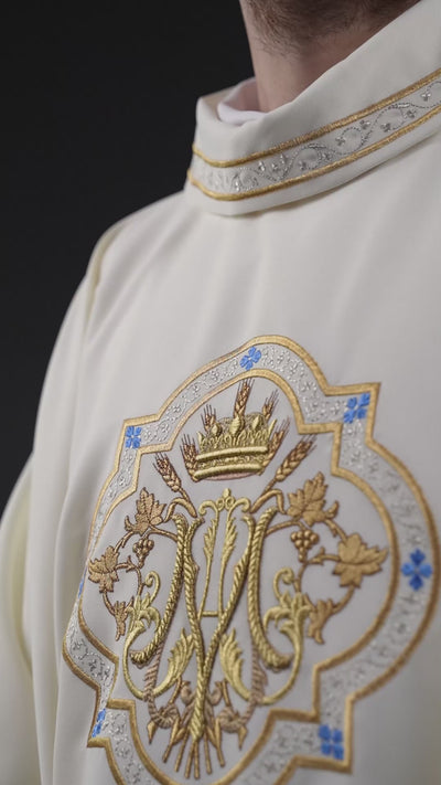 Embroidered Marian Coat of Arms: The centerpiece of the chasuble is a masterfully crafted embroidered Marian coat of arms in gold and blue, a symbol of reverence and devotion to the Mother of God.