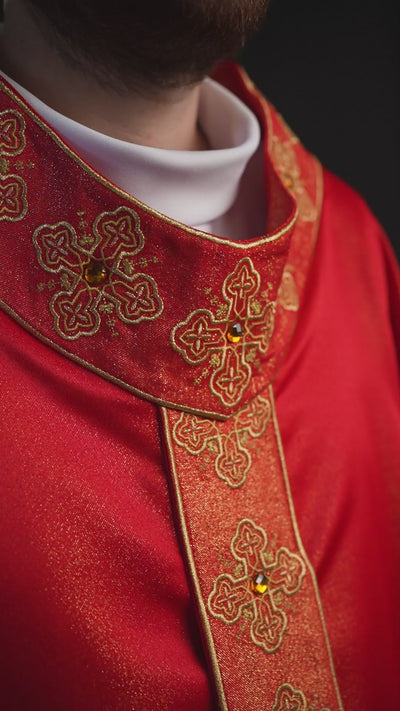 Richly decorated belt and collar with stones and embroidery depicting crosses, a symbol of the Christian faith. The gold embroidery looks beautiful on the red fabric, giving the chasuble an elegant and refined character.